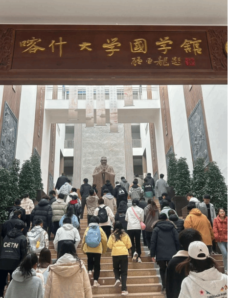 随后,同学们走进喀什大学国学馆。拾级而上,一尊孔子雕像映入眼帘,展现孔子教育思想对中国教育产生了深远的影响,他的许多教育理念和方法至今仍被广泛采用和传承。